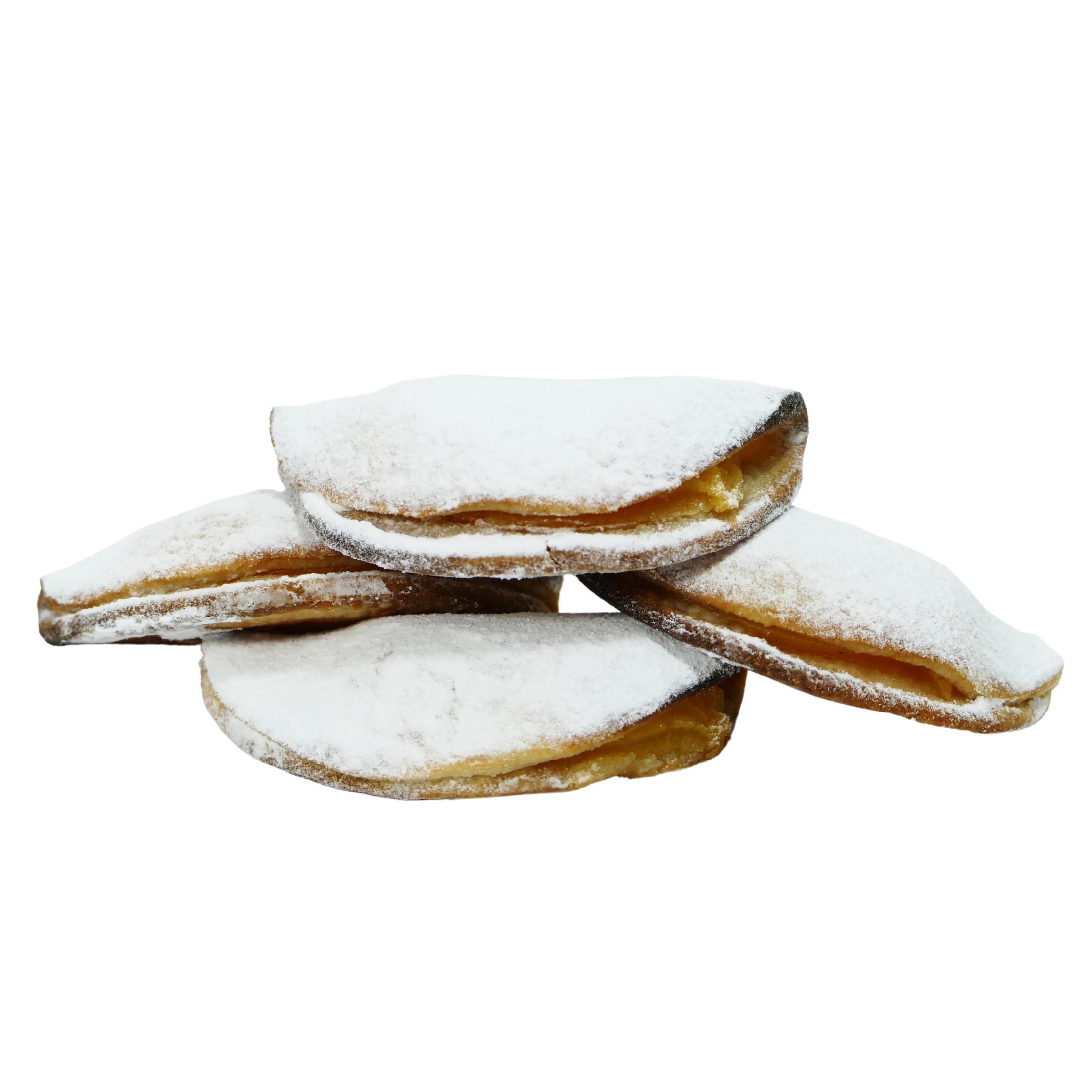 Estas empanadillas, que resultan sorprendentemente tiernas, están realizadas con una masa de mazapán relleno de una crema de yema con un poco de licor. El conjunto se espolvorea con azúcar glass.