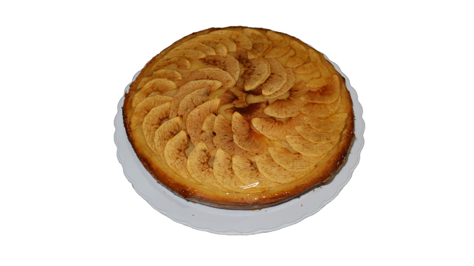 Base de bizcoho + relleno de crema + cobertura de láminas de manzana.
