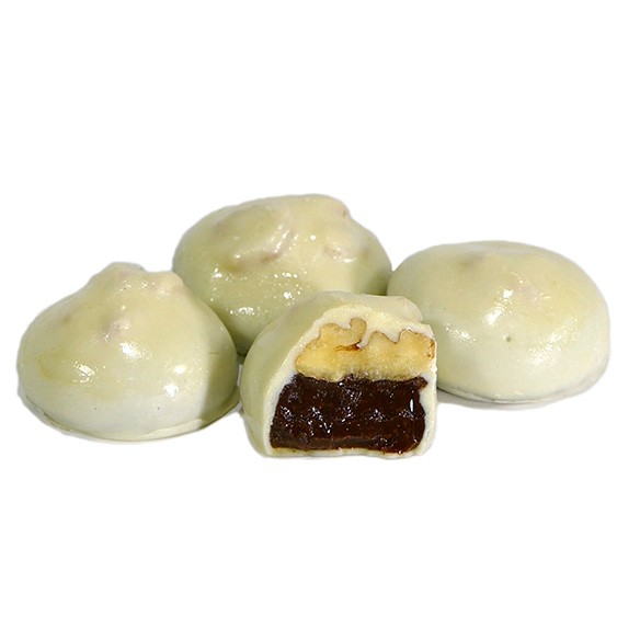 Cremosa ganache realizada con chocolates y coronada con una nuez, cubierta por una capa crujiente de chocolate blanco.
